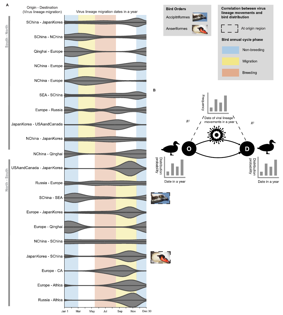 高致病性禽流感病毒(HPAIV)H5,特别是2.3.4.4亚型,自2014年以来在家禽中暴发,偶尔传播给人类,并导致不同物种的野生鸟类死亡增加。目前认为,野鸟迁徙是导致HPAIV H5全球传播的重要生态过程。研究证明了季节性鸟类迁徙可以解释2.3.4.4亚型全球传播的显著特征;发现了鸟类年周期相和病毒谱系移动的季节性之间的同步性;揭示了2.3.4.4亚型谱系运动的地理起源和目的地暴露不同的鸟类种类。研究提供了一个将鸟类运动生态学和禽流感基因组流行病学联系起来的基因组动力学框架,强调了将鸟类行为和生活史融入禽流感研究中的重要性。