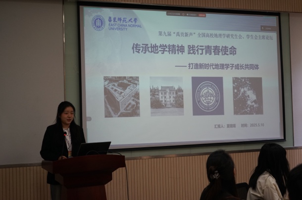 华东师范大学地理科学学院党委副书记罗艺做嘉宾致辞。罗老师充分肯定了主席论坛在促进地理学子跨校交流、促进青年学子成长的重要价值,论坛不仅是全国地学力量的汇聚,更是青年干部思想碰撞、锤炼本领的重要契机,期待以此次交流深化合作内涵,共同打造新时代地理人才的精神家园,勉励青年秉承五四精神,勇担学科使命。