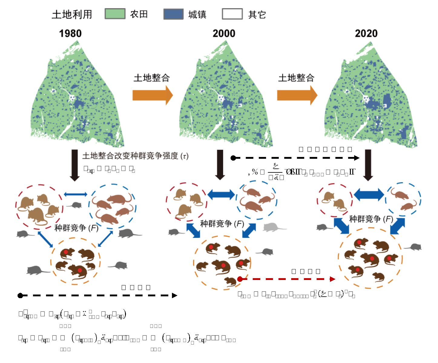 团队通过分析1980年至2022年的独特动物群落长期监测数据,将区域尺度上的土地利用变化与野生动物种群生态和生物多样性相联系,研究了人类栖息地内共生啮齿动物对土地利用变化的长期生态响应。研究发现,大规模的土地整理导致啮齿动物群落的丰度和组成发生显著变化,其中黑线姬鼠(汉坦病毒主要携带者)受益于土地整理,成为群落中的优势物种(图1)。 土地利用变化对三种常见的啮齿动物物种的影响不同,进而改变了它们之间的种间竞争结构。将土地整理指标纳入物种动态和疾病传播模型,揭示了土地整理通过抑制种内竞争和促进种间竞争,导致啮齿动物群落组成发生显著变化,啮齿动物多样性明显下降,最终增加汉坦病毒从宿主动物溢出风险