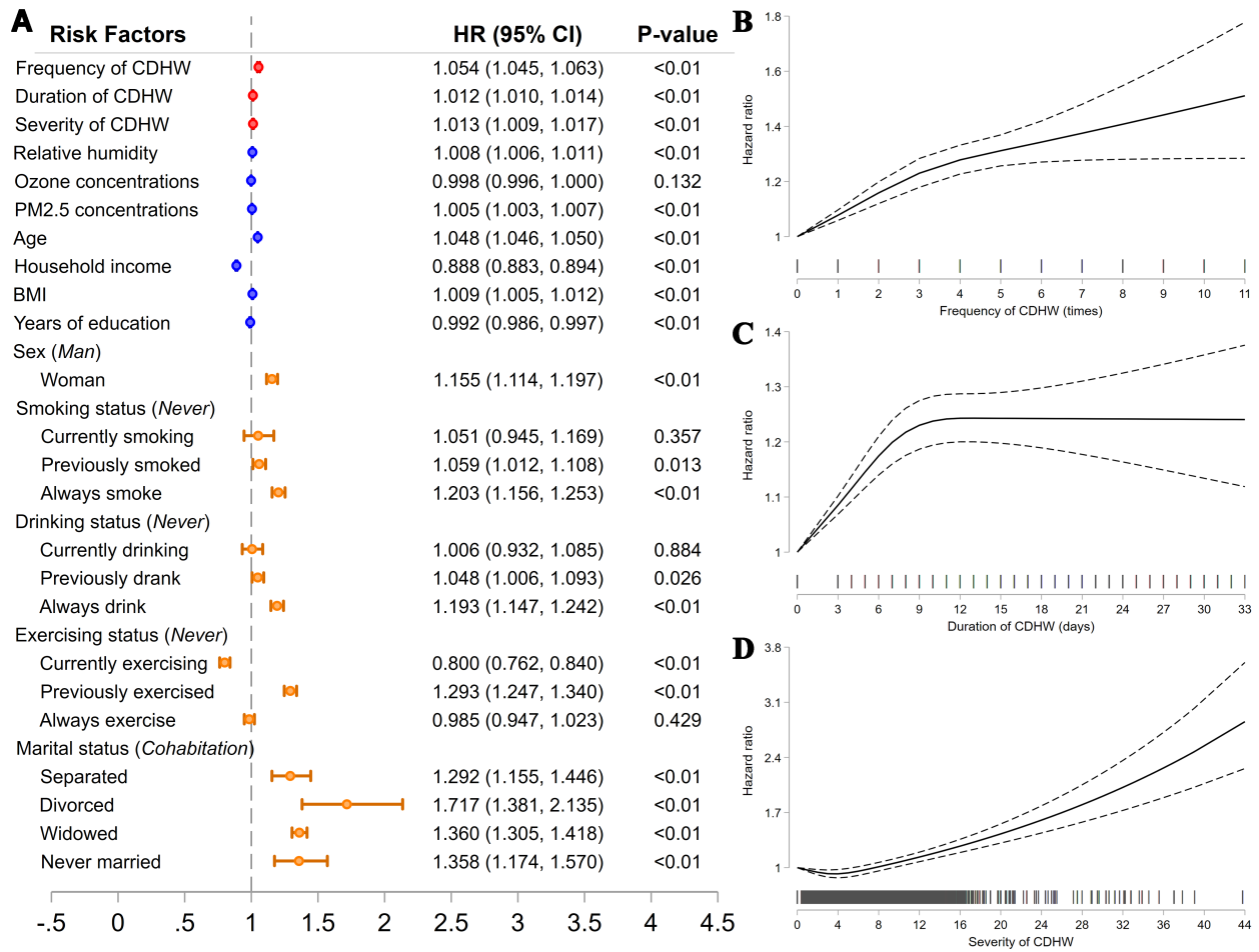 基于5个全球气候模式和10个全球气候—水文耦合模式的多模型偏差校正模拟输出,识别了中国历史时期(1941—2014年)和3种不同未来场景下(SSP1-2.6, SSP3-7.0, SSP5-8.5; 2015—2100年)45种不同定义的复合干旱热浪事件频率、持续时间和严重程度的时空变化。结合2002—2014年中国老年健康与家庭幸福调查(CLHLS),利用COX比例风险模型,评估了复合干旱热浪事件频率增加,持续时间延长和严重程度加剧对中国老年人死亡风险的线性、非线性和异质性影响(图2)