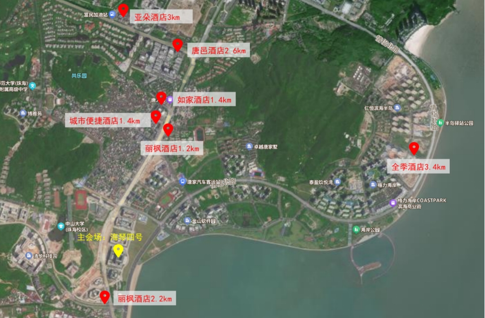 3.珠海城轨站距离会场约15.1公里,可在拱北口岸总站公交站乘坐10路A线(城轨唐家湾站方向)至白埔路口公交站,或乘坐K1、K3路至中山大学公交站,预计耗时1小时30分钟;