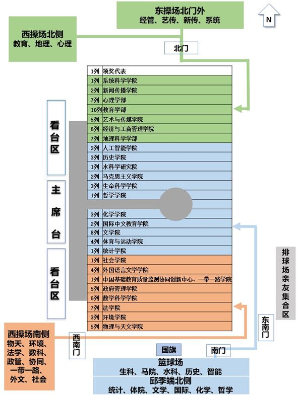 5.毕业生亲友于6:30前在排球场集合完毕,由现场工作人员及志愿者组织家长有序排队并检查入场凭证后,由东操场东南门入场,并按指定区域就座。