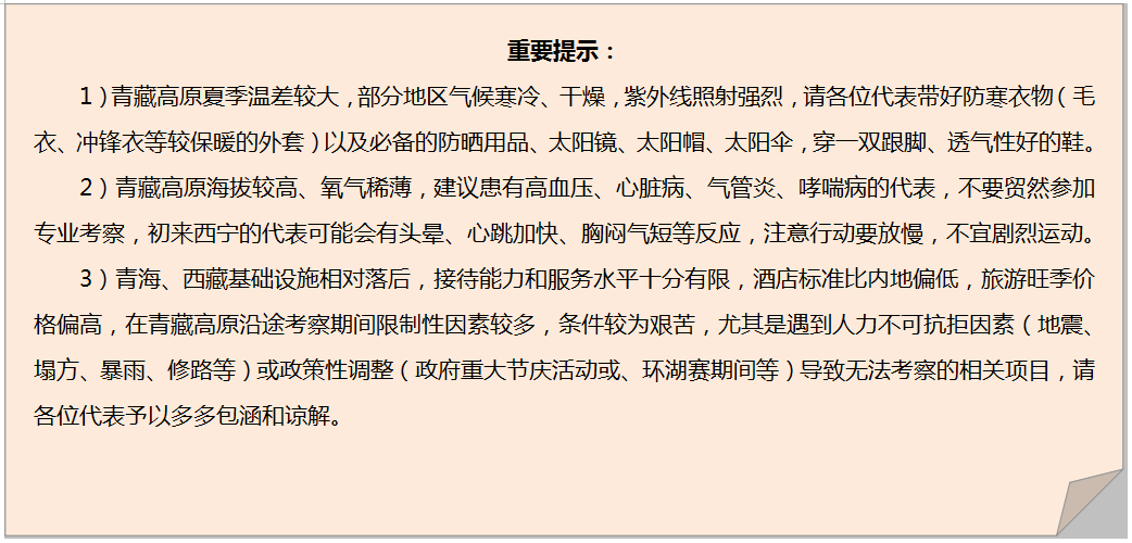 注意事项:因青藏高原7、8、9月份是旅游高峰期,返程机票和火车票十分紧张,请各位代表提前购买或预定好返程机票或火车票。
