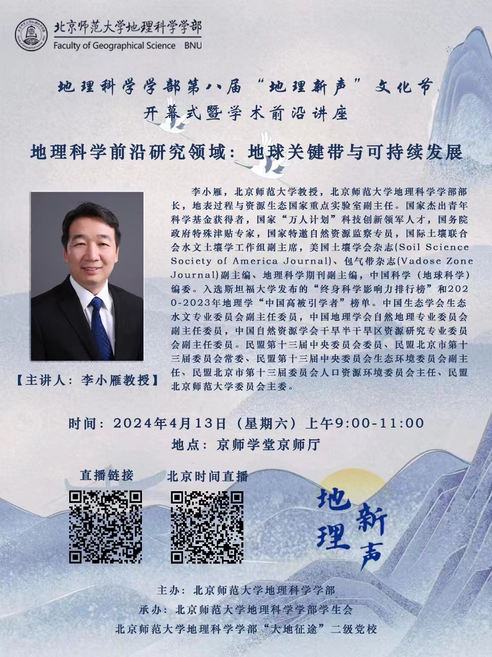 承地理之广大,发时代之新声!北京师范大学第八届“地理新声”文化节将于2024年4月13日正式拉开帷幕。开幕式暨学术前沿讲座将于4月13日上午9:00于京师学堂京师厅举办,届时,李小雁教授将为大家作题为《地球关键带与可持续发展》的主题讲座。