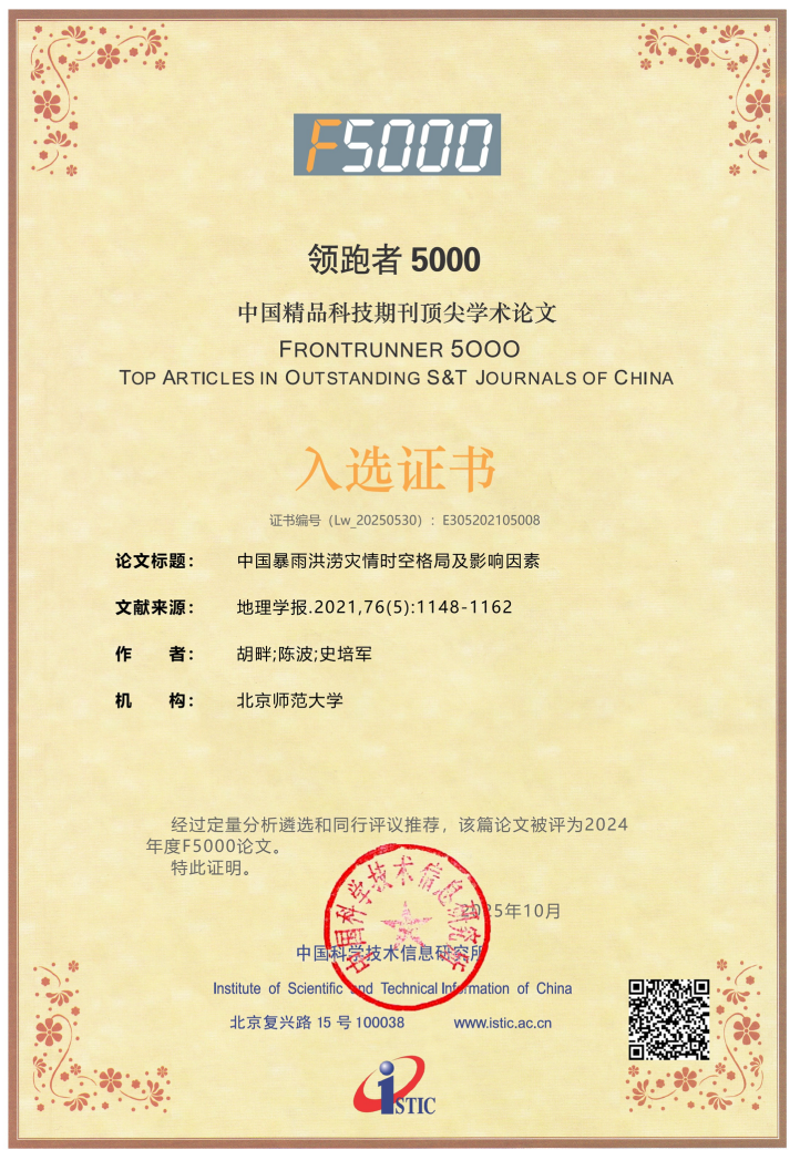 《中国暴雨洪涝灾情时空格局及影响因素》一文由北京师范大学地表过程与资源生态国家重点实验室、环境演变与自然灾害教育部重点实验室、2025最新博彩网址大全 、应急管理部-教育部减灾与应急管理研究院、2025最新博彩网址大全 、青海省人民政府-北京师范大学高原科学与可持续发展研究院共同完成,由胡畔(论文发表时系2025最新博彩网址大全 硕士研究生)、陈波、史培军(通信作者)合作完成,于2021年5月发表在《地理学报》(第76卷第5期 2021年5月,1148-1162页)。