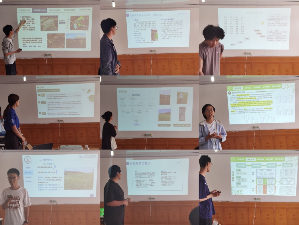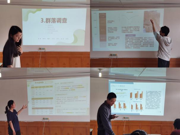 在7月 10 日的实习汇报中,上午进行了两个大组的集中汇报。各大组分别围绕实习期间所学知识、测量数据及具体探究问题,进行系统总结与展示。同学们从植被类型调查、物种分布特征分析,到土壤剖面观测与关键理化指标测定,详细介绍了实习过程中的发现与思考,内容充实、逻辑清晰,充分体现了实习期间理论与实践的紧密结合。下午,各自主实习小组依次汇报了小组自主选题实习的具体成果。内容丰富且精彩纷呈:有的小组探讨了当地委陵菜的空间分布特征;有的小组聚焦于不同土地利用下的土壤有机碳含量,通过实地调查与数据分析尝试厘清其分布规律。尽管自主实习时间有限,同学们依然取得了可观的成果,并在与老师和其他同学们的交流中收获了新的启发。不少同学对本组选题产生了进一步研究兴趣,将部分样品带回学校,计划继续开展深入实验与分析。老师们对同学们数日来的付出与成果给予了高度评价,并就研究方法与思路提出了建设性意见。同学们纷纷表示,此次实习不仅锻炼了野外调查与数据处理能力,也进一步激发了对科研探索的兴趣,为未来持续深入学习与研究打下了坚实基础。