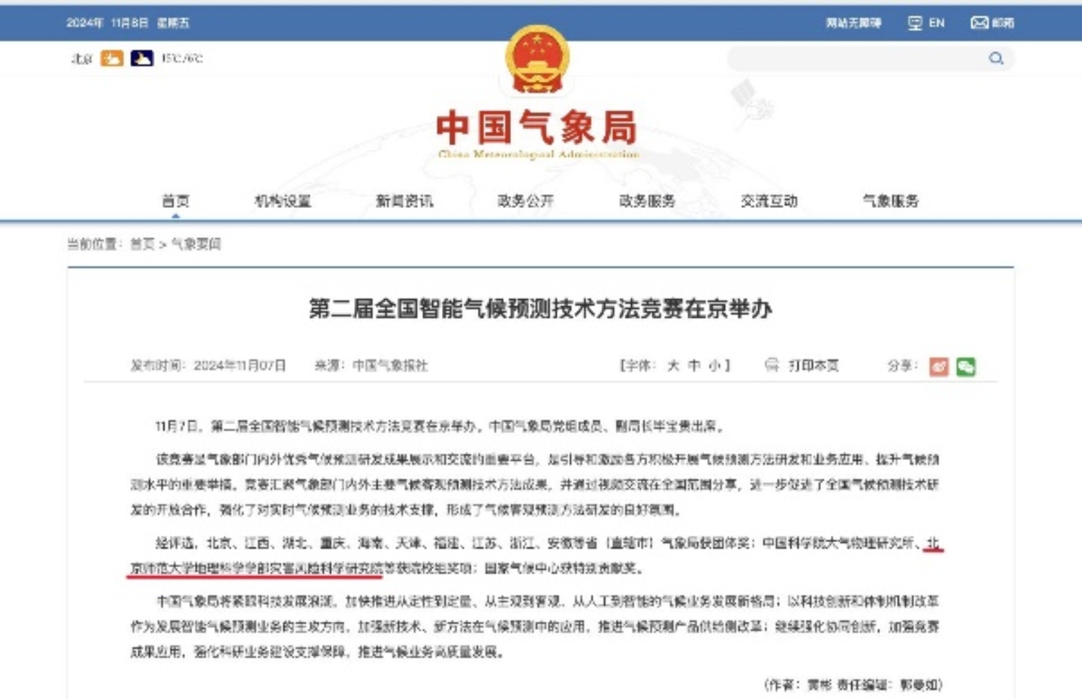 2024年4月-9月间,博彩网址-2025最新博彩网址大全 灾害风险科学研究院次季节气候预测联合团队参加了第二届全国智能气候预测技术竞赛,该团队在第一届预测竞赛中获得三等奖。2024年的预测竞赛难度增加,要求自4月1日始,每5天滚动提供未来30天的全国气候预测结果,一直持续到9月30日,共累计提交36次。团队基于多年技术和经验,圆满完成了全部次数的预测提交。最后经中国气象局综合检验,预测总体评分在全国12支重点院校及部队参赛队伍中名列第3,取得了二等奖的优异成绩。预测结果有力支撑了国家气候中心逐月汛期气候预测意见的形成,并为防灾减灾部署提供了重要科学依据。