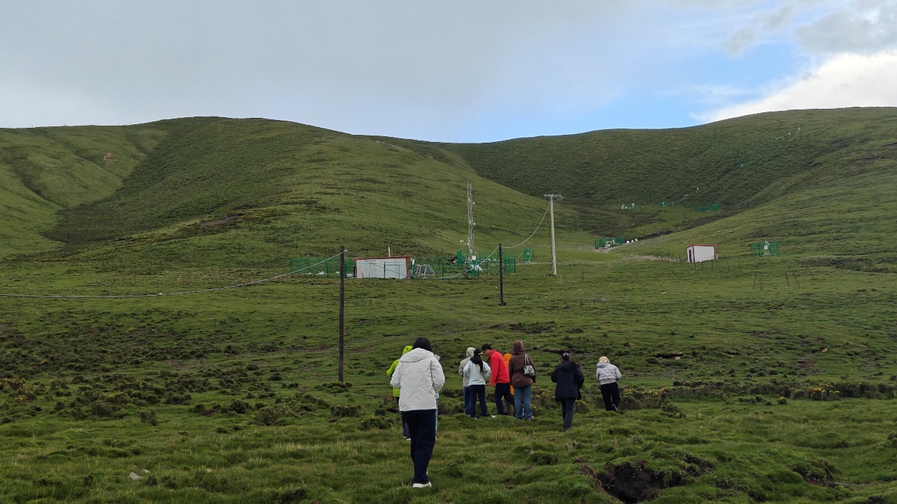 当老师们刚刚到达海拔3559多米的小流域观测站的时候,这里突然下起了小雨,很快又变成了冰雹。在装满了服务器和数据传输设备的简易房中躲雨的时候,赵老师介绍到,“我们在野外做试验,经常遇到这种情况,有位老师是做地表径流的,每到下雨就要出来测数据”,大家不由得感叹高原上科研的艰辛。雨停了,赵老师在室外为大家逐一介绍了观测仪器,碳水同位素廓线测量系统、宇宙射线土壤水分测量仪、蒸渗仪……环顾四周,在这片广袤的高原草甸上,基本上看不到庄户人家,当大家询问是如何通电时,赵老师说当时专门为这个站点架线。站在山脚下第一个观测点,教师们仰望着位于山腰和山顶的观测仪器,也进一步认识到学科在突破人类对自然规律的认识、促进环境保护与生态文明建设中发挥的作用,对“把论文写在祖国大地上”有了更深刻的理解。