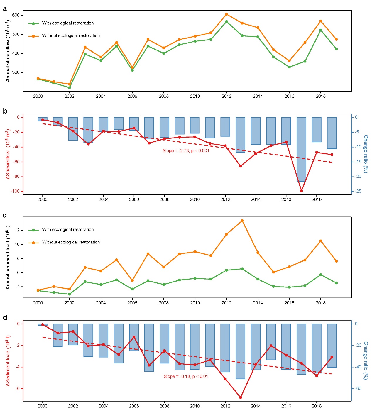 研究设计了有/无生态恢复两个情景,使用清华大学杨大文教授团队发展的含水土保持工程参数化的基于地形地貌的生态水文模型GBEHM-SWC(Geomorphology-Based Eco-Hydrological Model with Soil and Water Conservation parameterization)定量模拟两个情景下黄河流域2000-2019年水沙情况。研究发现,在不考虑上游水库运行和社会经济用水的情况下,有生态恢复情景下进入小浪底水库的多年平均天然径流量为401.35亿m3,比无生态恢复情景降低了7.9%,而多年平均输沙量为4.61亿t,比无生态恢复情景降低了38.9%(图1)。