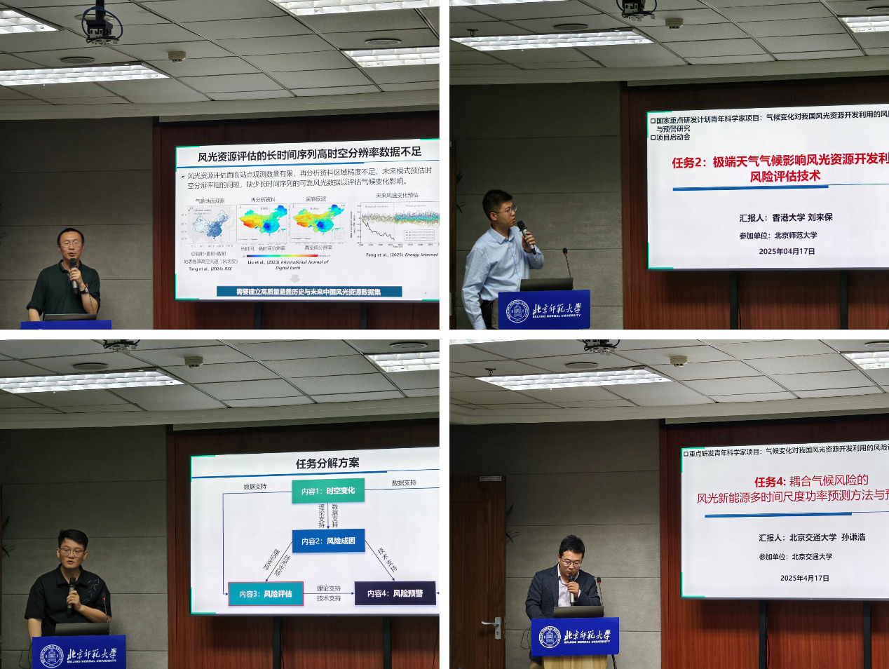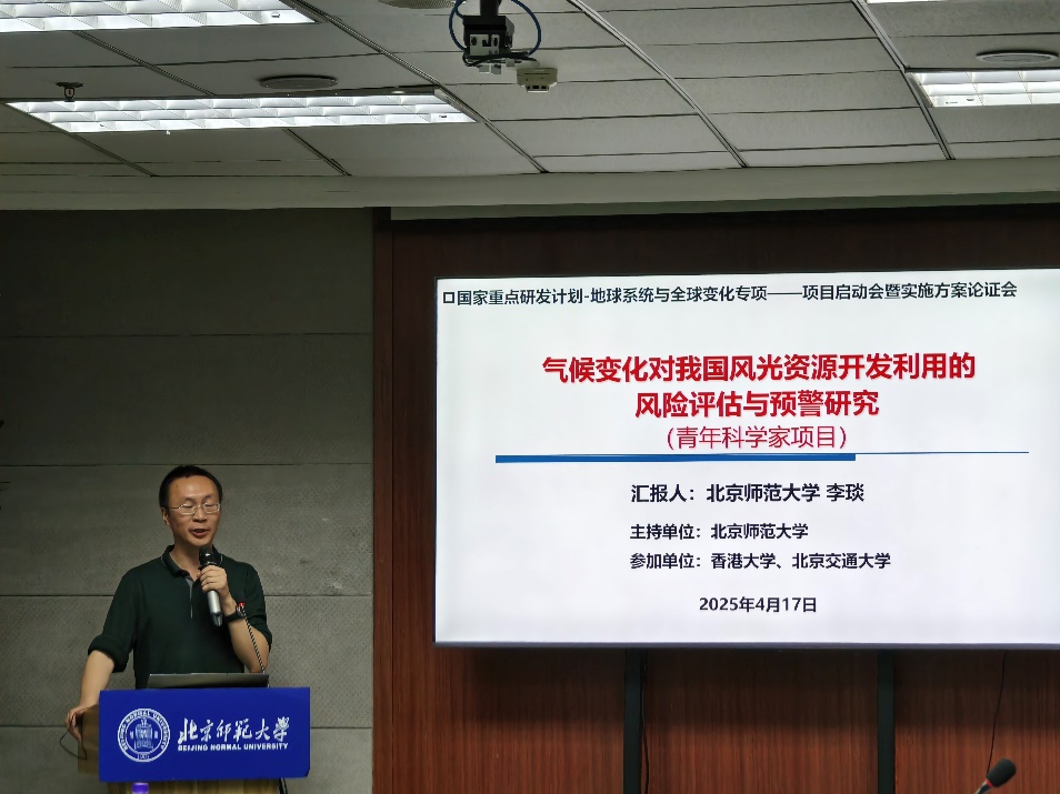 2025年4月17日下午,国家重点研发计划青年科学家项目“气候变化对我国风光资源开发利用的风险评估与预警研究”(项目编号:2024YFF0811100)启动会暨实施方案论证会在北京师范大学京师大厦召开。会议汇聚了来自科研机构、高校及企业的多位专家学者,围绕项目实施方案与研究任务展开深入交流与探讨,为项目的顺利推进奠定了坚实基础。