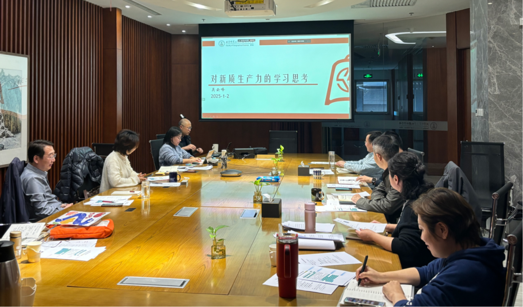 2025年1月2日,地理博彩网址 党委理论学习中心组于励耘学苑222会议室举行月度专题学习会议,围绕“对新质生产力的学习思考”展开深入交流研讨。此次专题学习活动由徐洪书记主持,吴云峰常务副部长担任主讲人。