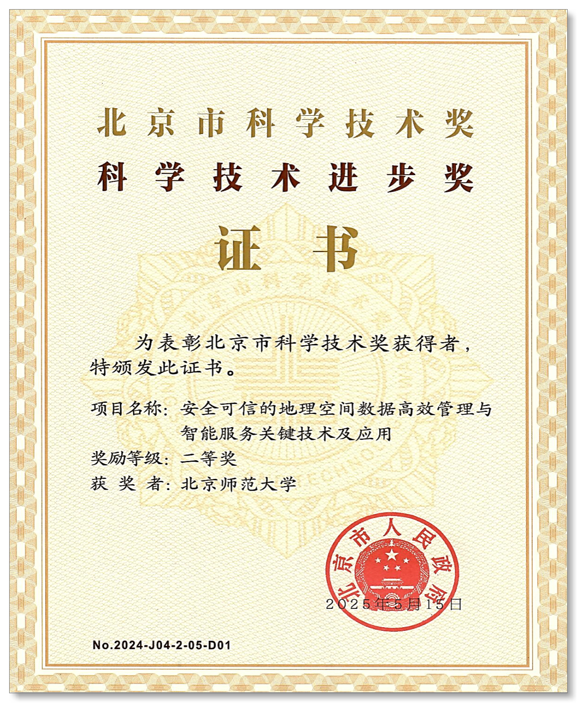 “安全可信的地理空间数据高效管理与智能服务关键技术及应用”成果荣获北京市科学技术奖科学技术进步二等奖。该成果由北京师范大学牵头,2025最新博彩网址大全 程昌秀教授、岳建伟教授级高工为核心完成人,联合中国科学院地理科学与资源研究所、中国科学院信息工程研究所、中国水利水电科学研究院,以及北京博阳世通信息技术有限公司、苍穹数码技术股份有限公司共同攻关完成。
