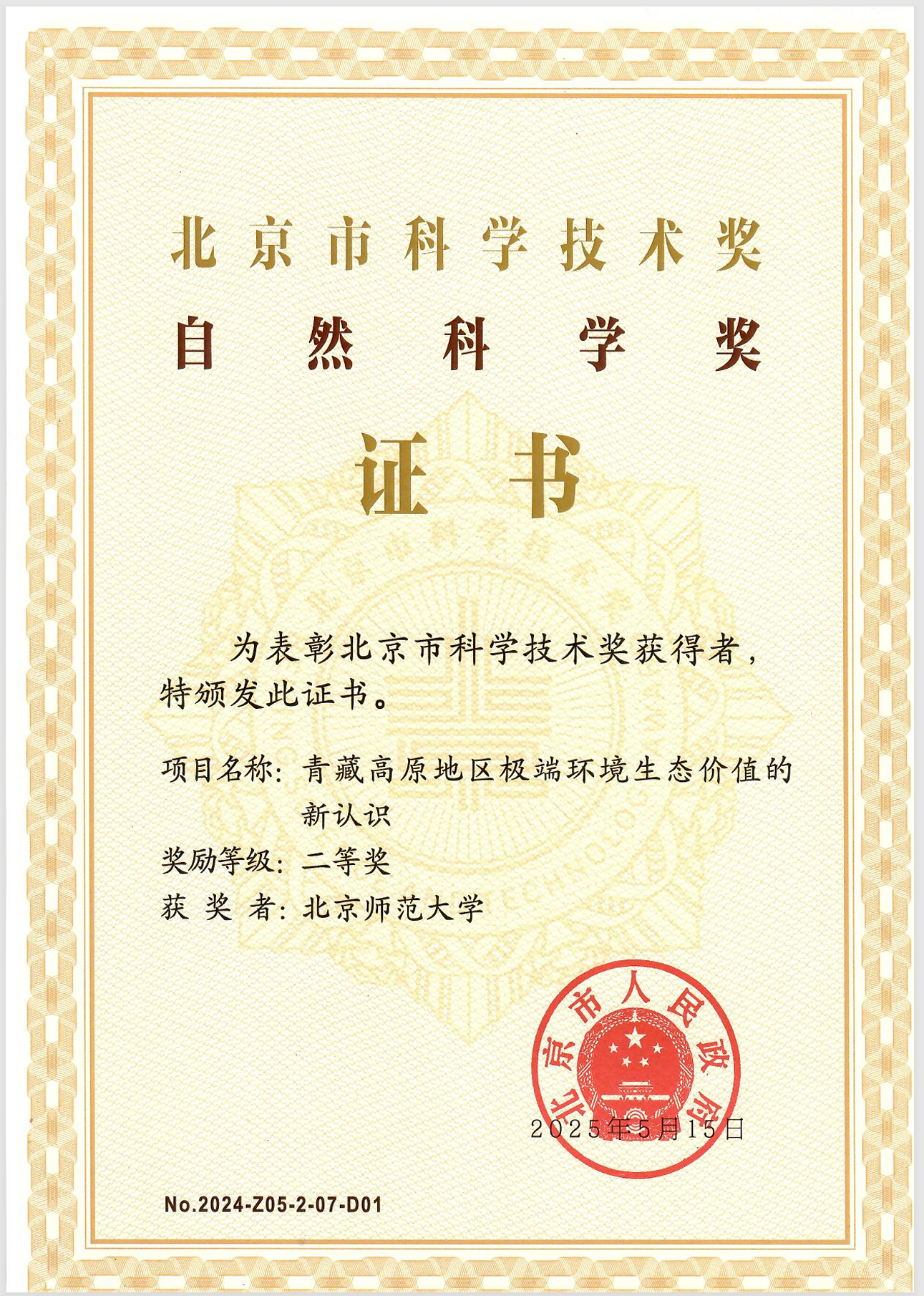 “青藏高原地区极端环境生态价值的新认识”荣获北京市科学技术奖自然科学二等奖,北京师范大学为该成果的唯一完成单位,博彩网址-2025最新博彩网址大全 史培军教授、于德永教授、周涛教授、朱文泉教授、唐海萍教授,以及博士研究生陈彦强、韩东妮、刘霞、姜楠为该成果的完成人。