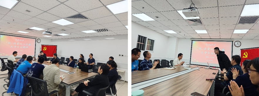 宣讲结束后,与会人员感到意犹未尽,开展了积极的交流。围绕党的二十届三中全会上提出的科技发展目标,大家就如何将研究点与国家大政方针结合,以生态文明为突破点,为实现科技强国、达到国际领先水平贡献力量等话题开展了热烈讨论。会议最后,穆望舒老师作总结发言。他表示,这次会议让支部成员对党的二十届三中全会精神的学习更加深刻,希望各位老师今后能立足科研岗位,为推动现代化建设贡献力量。