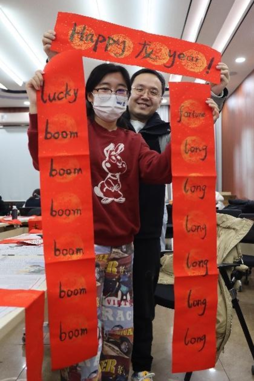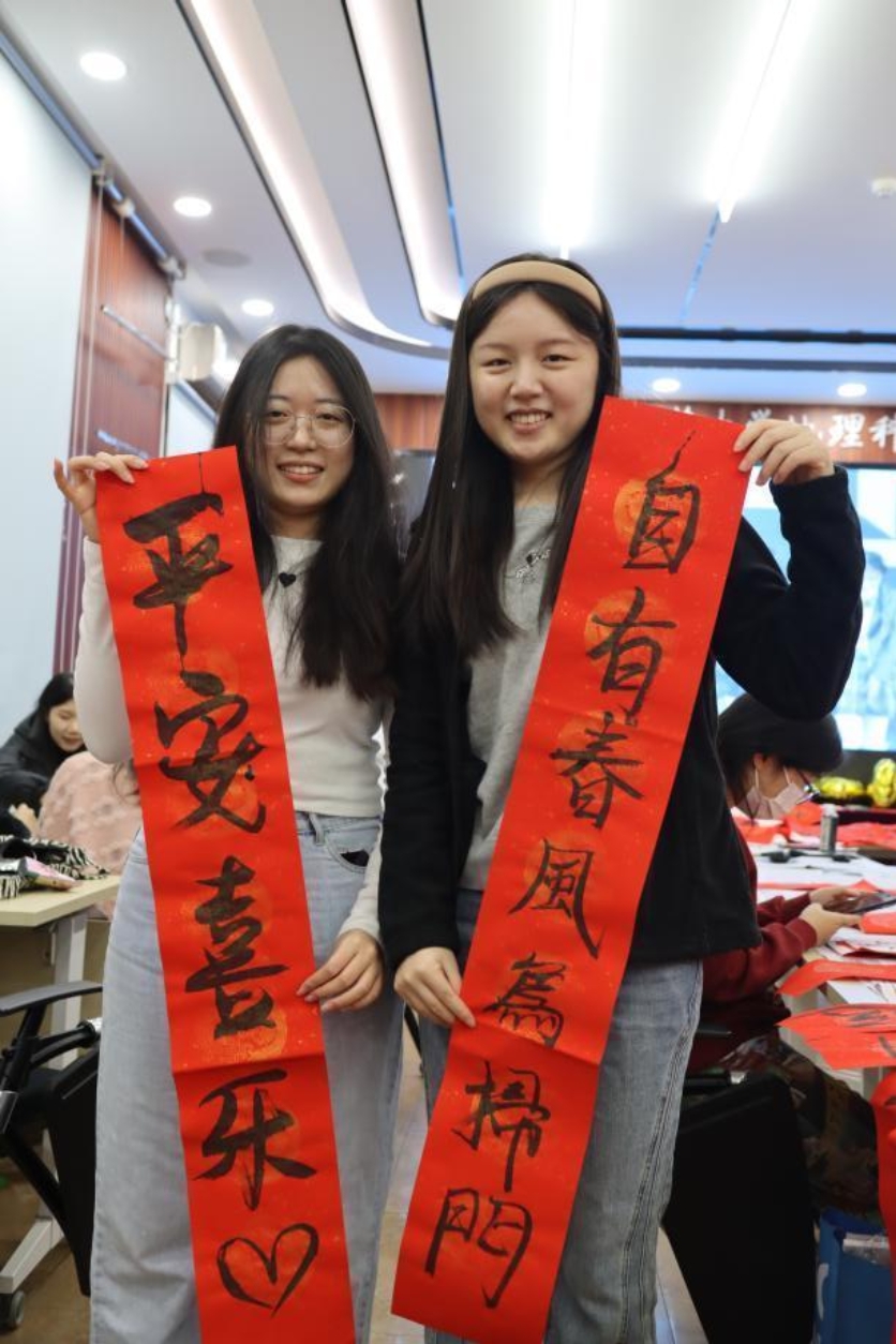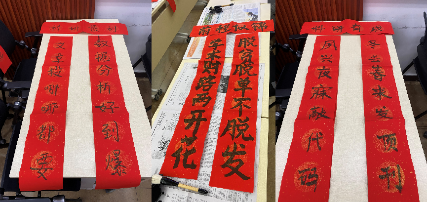 师生齐聚写对联、写福字,送给彼此祝福。“冬去山川齐秀丽,喜来桃里共芬芳”“一年好运随春到,四季彩云滚滚来”“家过小康欢乐日,春回大地艳阳天”……除了传统的新春祝福外,还有充满创意的“脱贫脱单不脱发,学术财路两开花”“文章投哪哪都要,数据分析好到爆”“夙兴夜寐敲代码,冬去春来发顶刊”等科研人的美好愿景。