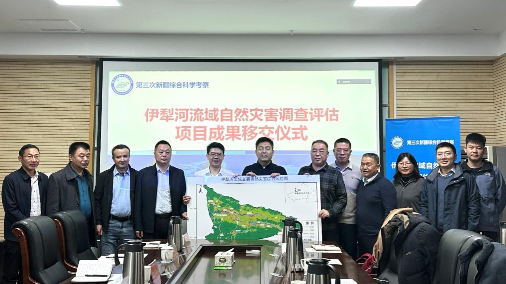 项目首席武建军教授介绍了项目研究进展及取得的成果,项目团队采用空天地一体化与灾害过程模拟协同的新方法,完成了对伊犁河流域多灾种自然灾害的系统调查与评估,构建了精细化的自然灾害调查数据集,完成伊犁河流域主要灾害类型、多灾种及未来气候变化多情景风险评估,提出适应未来气候变化的灾害应对策略。本次移交的主要成果包括伊犁河流域多灾种、多要素、多尺度、长时序灾害风险数据集,高精度的单灾种及多灾种综合风险调查评估图集,以及相关报告和研究论文。