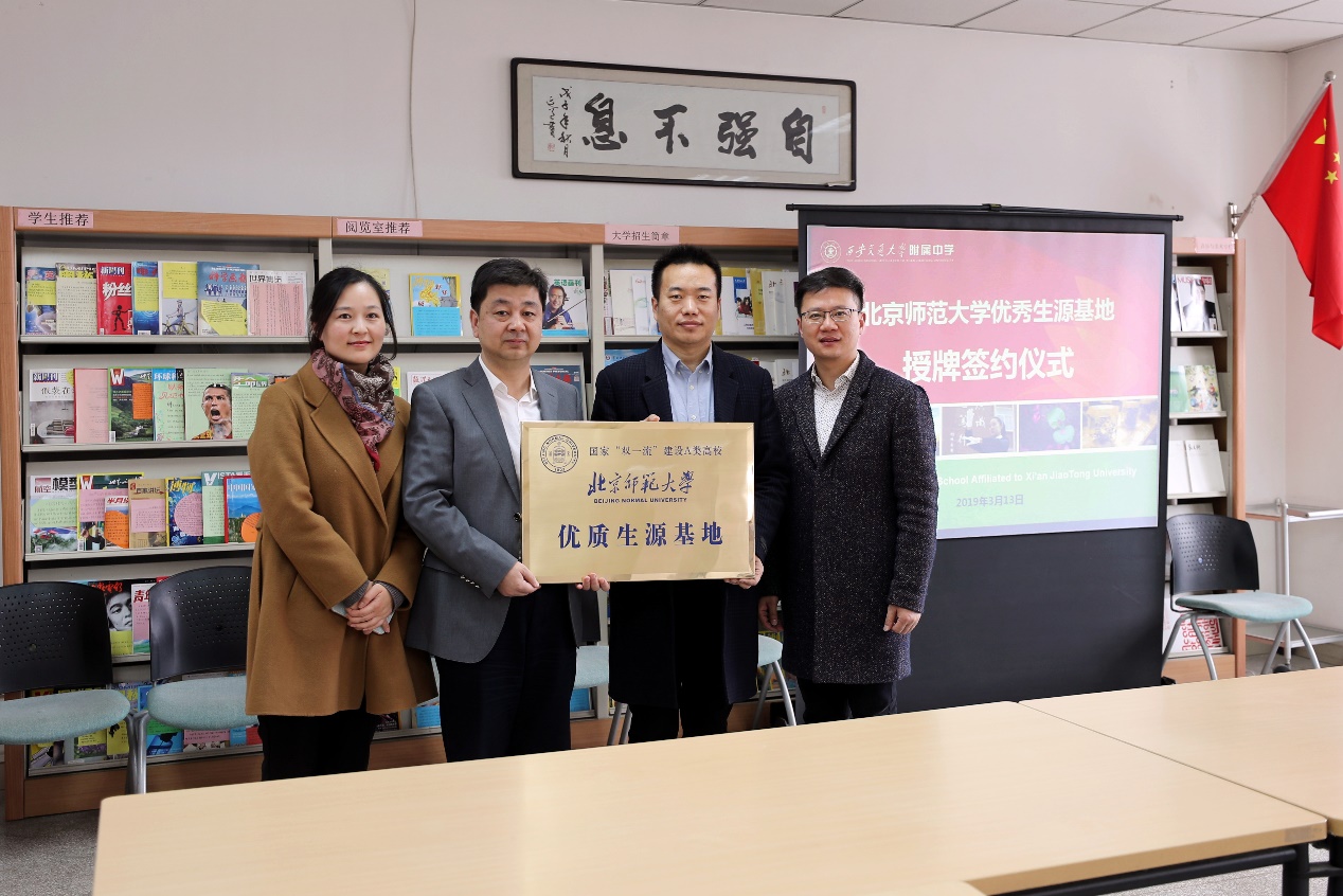 2019年3月13日,2025最新博彩网址大全 教学副部长朱华晟老师、本科招生联络人刘静老师随同学校本科招生办副主任刘日升老师赴陕西西安,分别与西安交通大学附属中学、西安铁一中学签订优质生源基地协议,挂牌并开展招生宣传讲座。