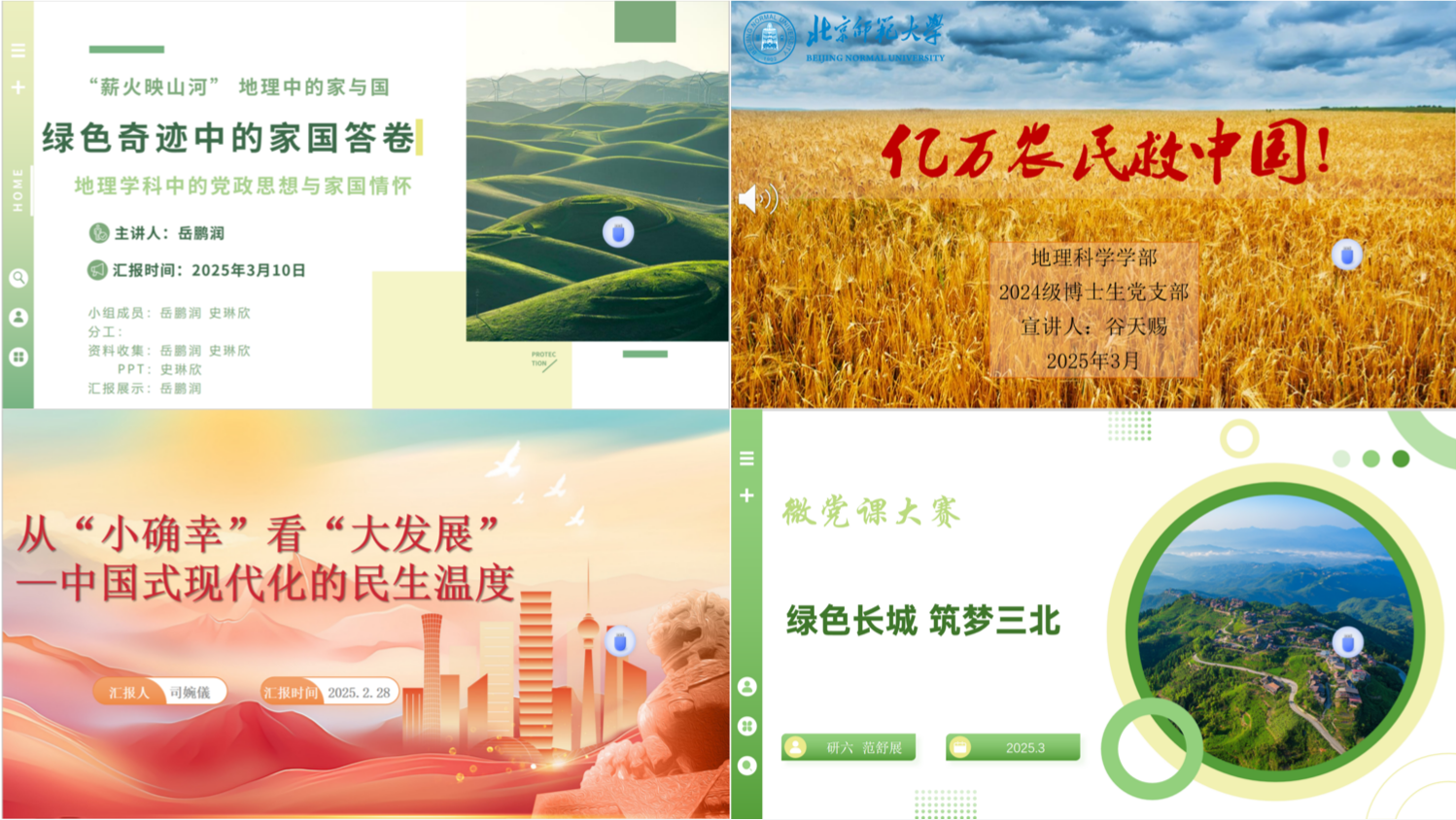 比赛伊始,主持人李则仕详细介绍了比赛流程与评分规则,并致开幕词。本次大赛共有来自各支部的22名选手参加。博彩网址 党委副书记陈蓉蓉、党团学工办公室主任石月婵、党团学工办公室赵敏和王元慧四位老师,以及北京师范大学第九届微党课大赛优胜选手王子晴和周慧馨两位同学受邀担任评委。参赛选手们依照抽签顺序依次展示。他们围绕革命精神、时代精神、绿色发展等主题,使用PPT、视频等多种素材,用微党课的方式,生动展现了党的光辉历程——从深入学习党的二十大理论的深刻领悟到全面贯彻党的二十届三中全会精神的坚定步伐,从雄安新区的蓝图绘就到京津冀协同发展的壮阔实践,从地理空间中的家国情怀到生态文明建设的绿色篇章,选手们以生动的案例,展现了新时代中国发展的蓬勃生机。选手们以富有感染力的语言和真挚的情感,将党的理论与时代脉搏精髓娓娓道来,深深打动了在场的听众。