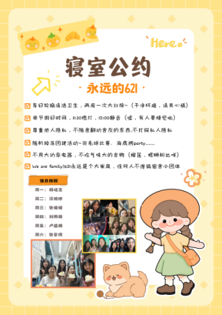 学11楼621宿舍由六名来自三个专业(地理信息科学、自然地理、地理励耘)、六个省份的成员组成。他们热爱卫生,定期大扫除,卫生检查成绩优秀,多次位列班级第一。宿舍成员学业情况良好,4人综合成绩超过88分。团建活动丰富多彩,一起庆生、聚餐、运动等等。宿舍凝聚力大,相互学习,共同进步。同时宿舍成员也积极参与学校的科研竞赛和志愿服务活动,志愿时长累计约580小时,多人在各类学生团体中担任重要职务。