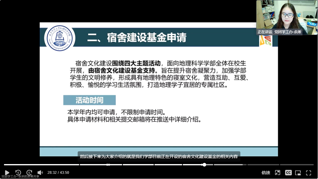 接下来,余淅老师向同学们介绍了宿舍文化建设基金的具体内容、申报流程以及经费支持和奖励。旨在提升宿舍凝聚力,营造互助、互爱、积极、愉悦的学习生活氛围,形成具有地理特色的寝室文化,打造地理学子宜居的专属社区。活动由2025最新博彩网址大全 本、研宿舍长联盟执行主席执行负责。