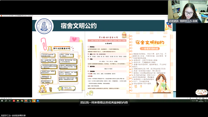 同时,余淅老师展示了优秀宿舍文明公约范例,向同学们说明了宿舍公约的制定与执行可以规范行为、促进宿舍成员的沟通,有助于营造宿舍内的和谐、安全、舒适的居住氛围,强调了宿舍公约制定的重要性和必要性。