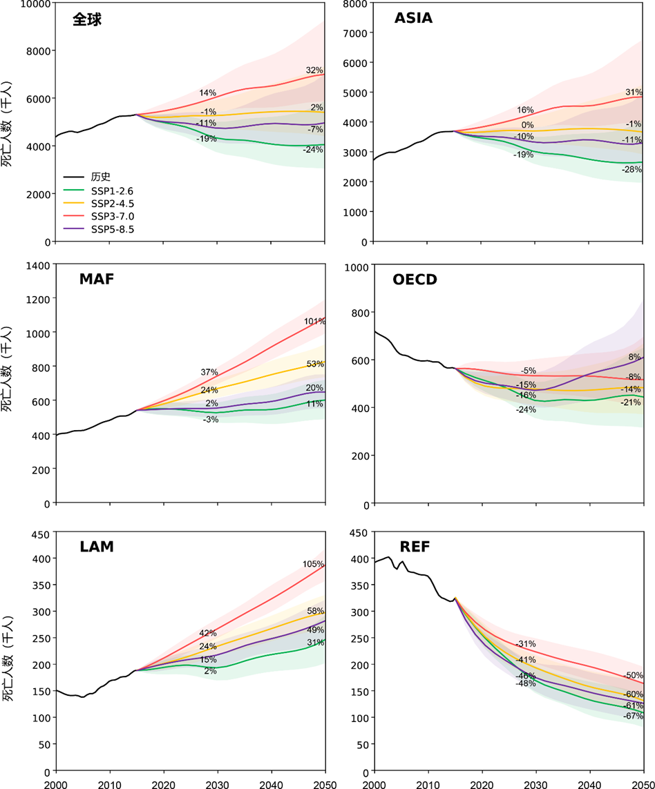 图1 PM2.5污染相关死亡人数(DAPP)的历史变化和到2050年实现可持续发展目标(SDG)3.9的预期达成情况。a 全球尺度DAPP的变化,b–f 区域尺度。实线代表平均估计值,阴影表示未来PM2.5浓度(来自11个地球-气候系统模型)和疾病死亡率(来自统计模型)的95%置信区间。缩写定义如下:ASIA(亚洲,不包括中东、日本和前苏联国家)、MAF(中东和非洲)、LAM(拉丁美洲和加勒比地区)、OECD(经济合作与发展组织和新欧盟及其候选国)、REF(东欧和前苏联国家的改革经济体)。