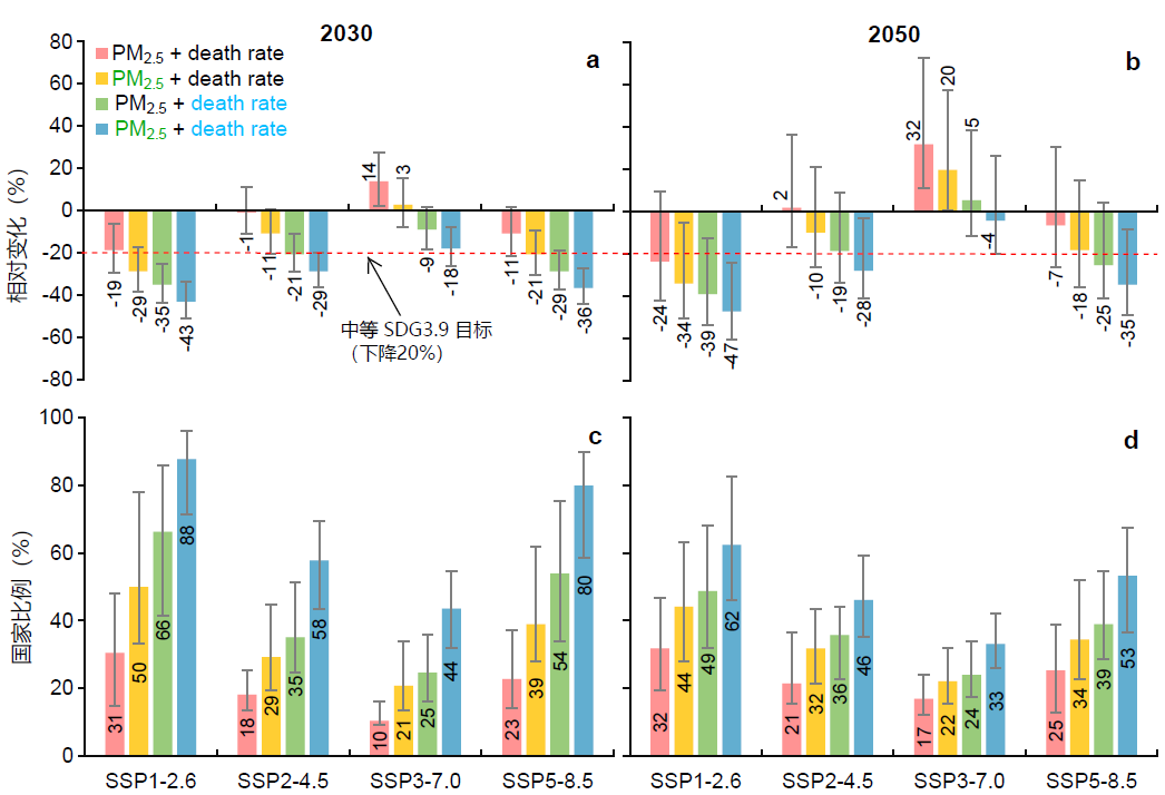 图3:进一步改善空气污染控制和医疗保健对达到中等可持续发展目标(SDG)3.9的潜在影响。a, b 2015-2030年和2050年PM2.5污染相关死亡人数的相对变化。c, d 到2030年和2050年实现中等SDG3.9的国家百分比(基于154个国家计算)。图例中的颜色表示,由于空气污染控制和医疗保健的进一步改善,PM2.5浓度(绿色)和疾病死亡率(蓝色)相对于预估值降低了20%。