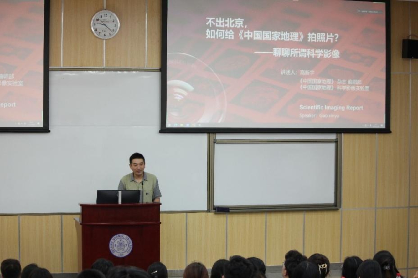 嘉宾致辞后,高新宇老师作题为“镜头里的地理之美”的精彩讲座,通过《中国国家地理》杂志的“追日摄影”等案例,揭示天文现象与地理空间精准测算的融合艺术。整场讲座贯穿“艺术科学化 科学艺术化”理念,激励青年学子以跨界视野探索植物地理分布等前沿课题,用影像语言书写新时代地理学的担当。与会人员就如何进行野外拍摄、城市景观拍摄以及拍摄时如何获得云层厚度、高度角等问题积极展开讨论,现场气氛热烈。
