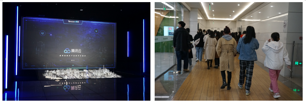 进入展厅前,工作人员为大家讲解了总部大楼的整体设计,突出“绿色、健康”的设计理念。随后,工作人员带领大家开启了腾讯之旅——参观公司展厅。