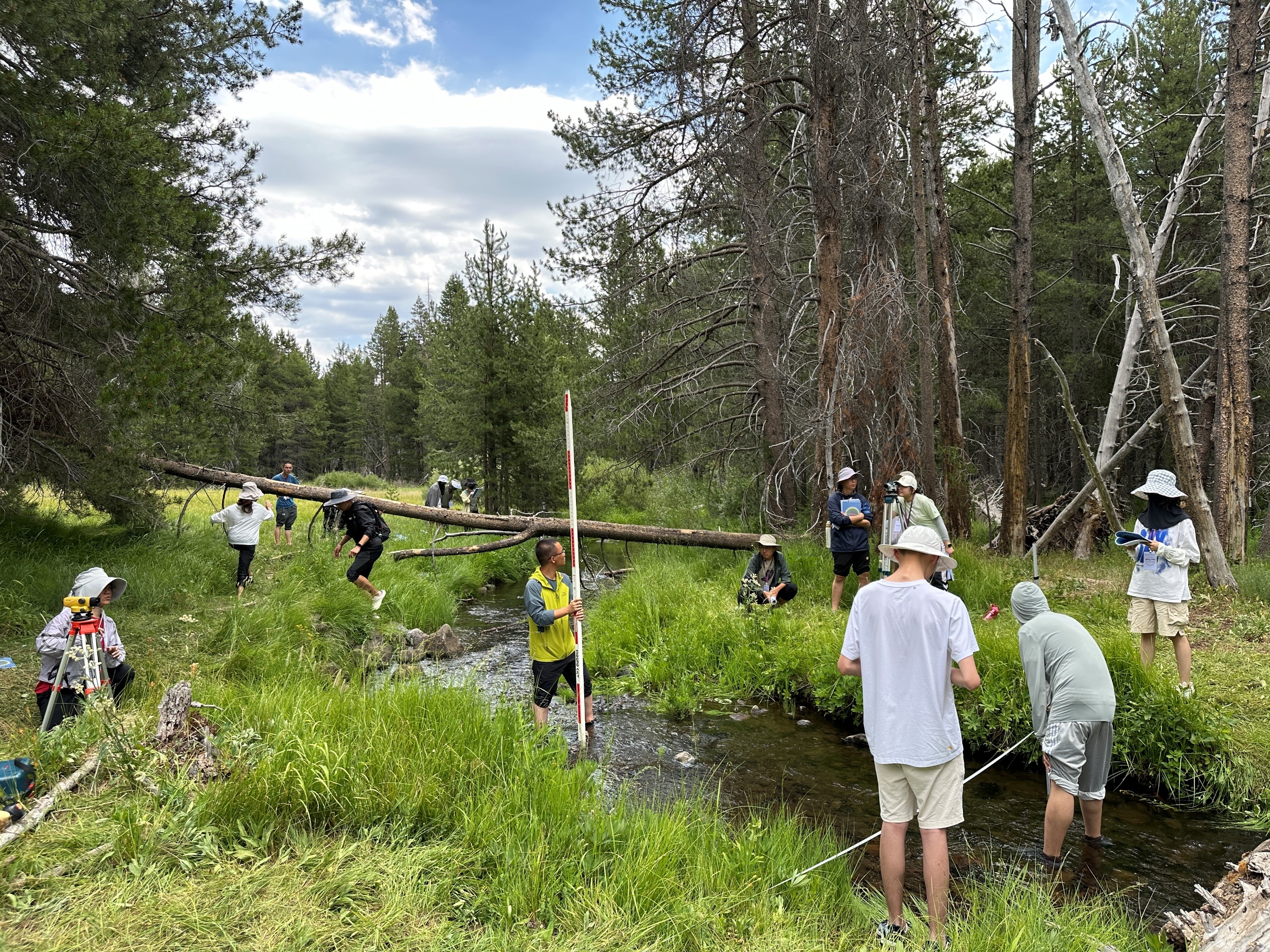 此次科考主要包括4个部分:河流水文测量、激光雷达应用、空气质量监测和加州人文考察。当地时间7月23日下午,各校科考团成员悉数抵达美国旧金山国际机场,随后驱车前往科考第一站——Sagehen Creek Field Station。接下来的2天内,科考团成员选取Sagehen Creek的部分河段进行调查:在绘制河段整体形态的基础上,分组开展流量测量、卵石统计,以及横断面和纵剖面测量。野外测量结束后,科考团成员回到室内进行相关数据汇总、分析和汇报。