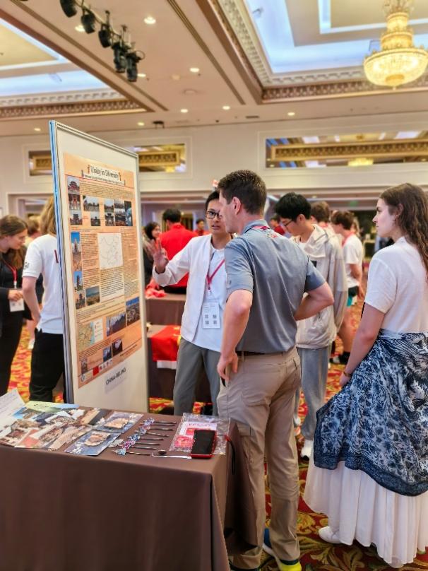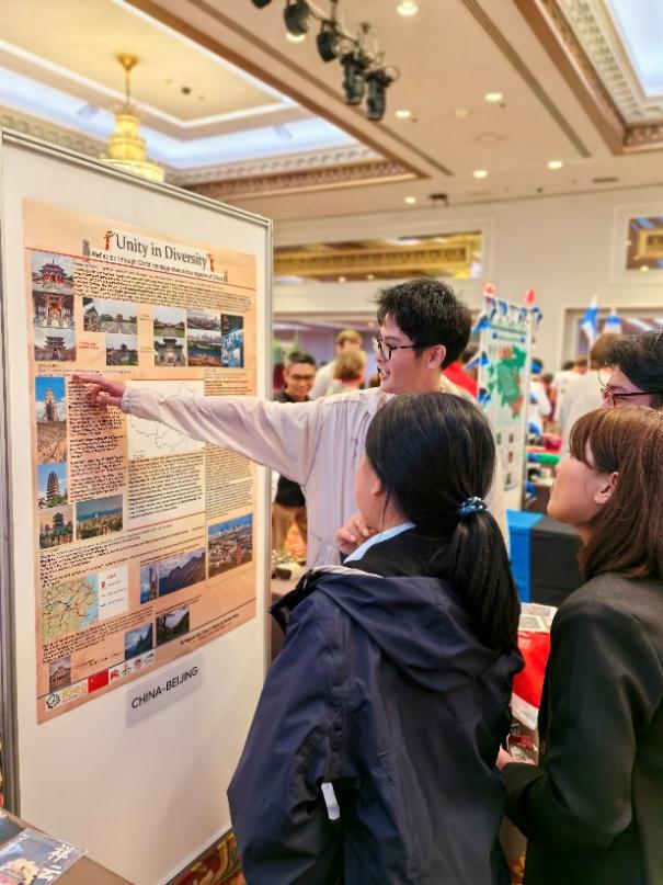 中国(北京)队参赛队员向其他国家队员和教师介绍海报