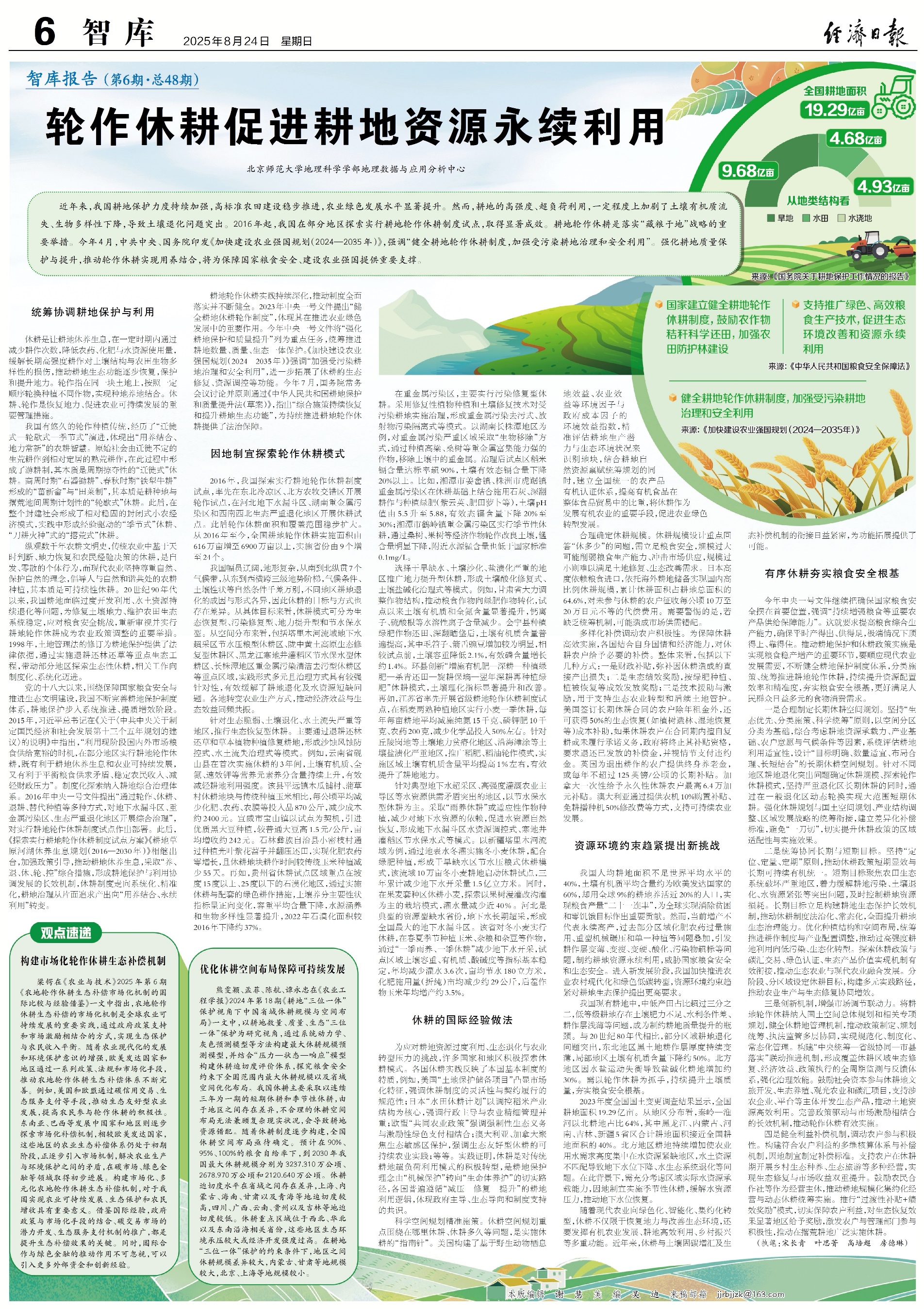 耕地轮作休耕实践持续深化,推动制度全面落实并不断健全。2023年中央一号文件提出“健全耕地休耕轮作制度”,体现其在推进农业绿色发展中的重要作用。今年中央一号文件将“强化耕地保护和质量提升”列为重点任务,统筹推进耕地数量、质量、生态一体保护。《加快建设农业强国规划(2024—2035年)》强调“加强受污染耕地治理和安全利用”,进一步拓展了休耕的生态修复、资源调控等功能。今年7月,国务院常务会议讨论并原则通过《中华人民共和国耕地保护和质量提升法(草案)》,指出“综合施策持续恢复和提升耕地生态功能”,为持续推进耕地轮作休耕提供了法治保障。