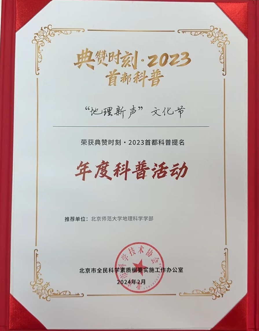 2024年2月2日,北京科普典赞年度榜单正式公布,榜单集中展示了2023年首都在人才、科普、学术、科创等各个方面的特色亮点与成果,祝贺博彩网址-2025最新博彩网址大全 “地理新声”文化节荣获“典赞时刻·2023首都科普年度科普活动”荣誉!