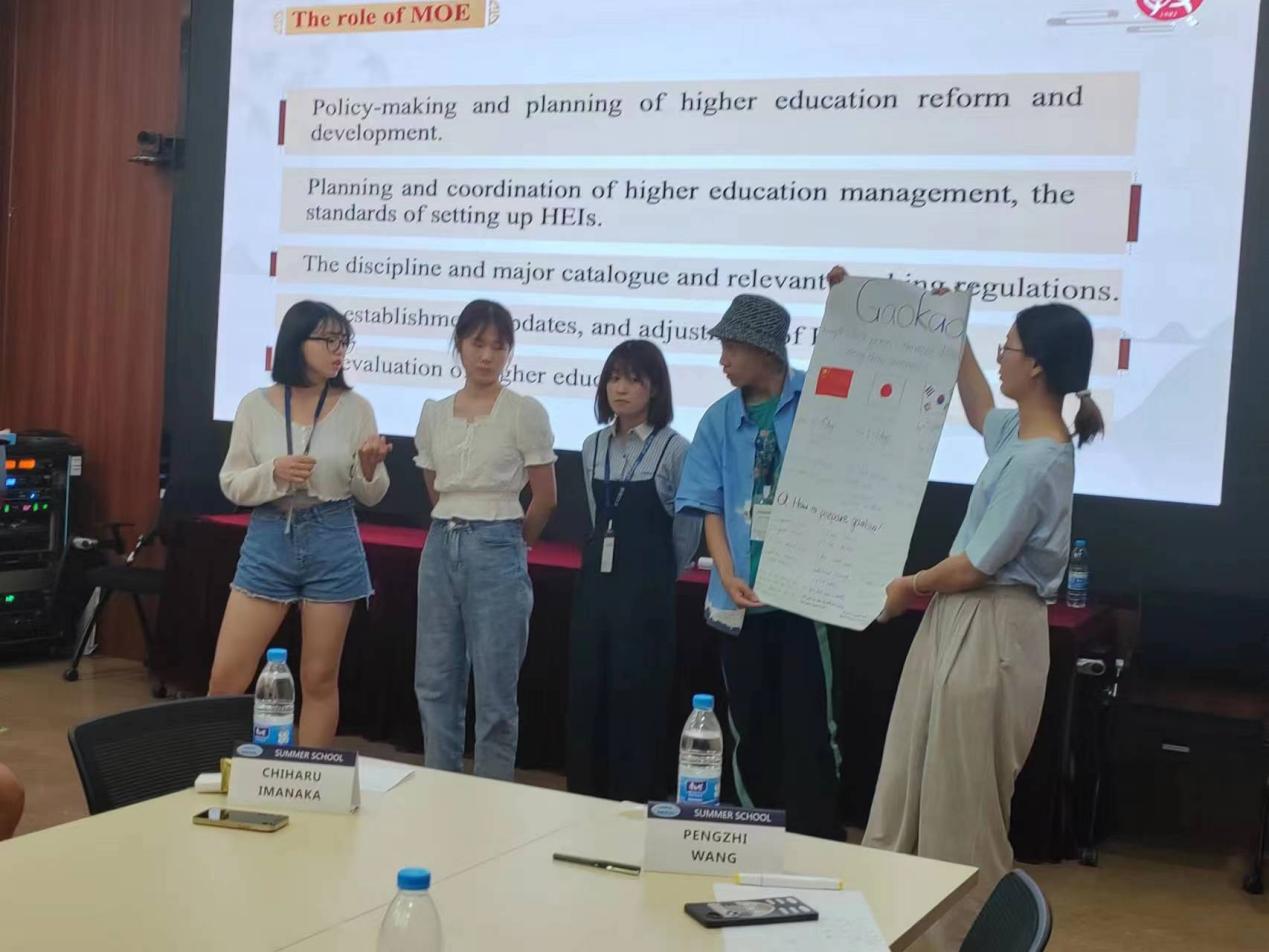 8月26日下午,教育博彩网址 桑国元老师讲授了“中国的教育制度”课程,他使用了PBL教学法,以学生为中心,让大家提出问题并讨论解决,最后进行汇报展示,每个小组的中日韩三国学员都分别介绍了自己国家的教育制度。四个小组从不同角度进行介绍,大家对不同国家的教育有了更进一步的认识。