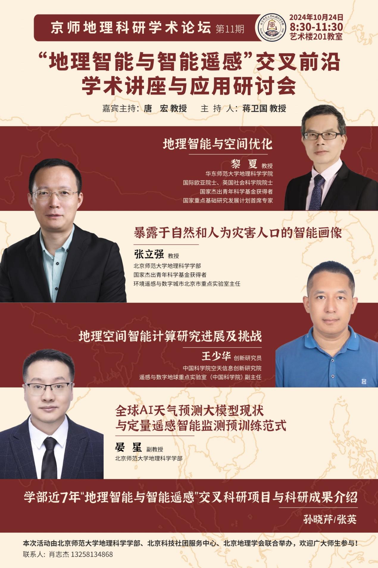 2024年10月24日(周四)上午8:30,京师地理科研学术论坛第11期之“地理智能与智能遥感”交叉前沿学术讲座与应用研讨会,将在北京师范大学艺术楼201教室举行。