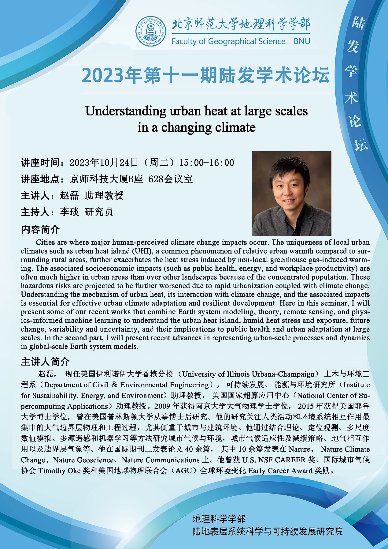 【10月24日】2023年第十一期陆发学术论坛,赵磊 助理教授, Understanding urban heat at large scales in a changing climate