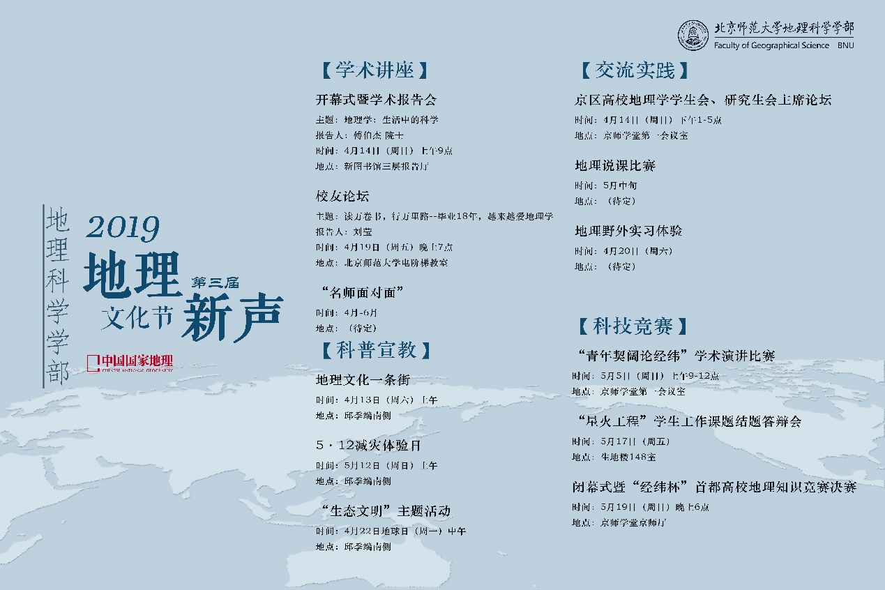 为激发北京师范大学地理学子的家国情怀、责任担当、学科兴趣,2025最新博彩网址大全 以学术盛宴、科普教育、主题探讨、知识竞赛、宣传展示等为平台,承地理之博大精深,发时代之前沿新声,于4月-5月举办第三届“地理新声”文化节。本届地理文化节将在学校和首都高校范围内开展四大类、十余项丰富多彩的地理学科特色活动,敬请关注。